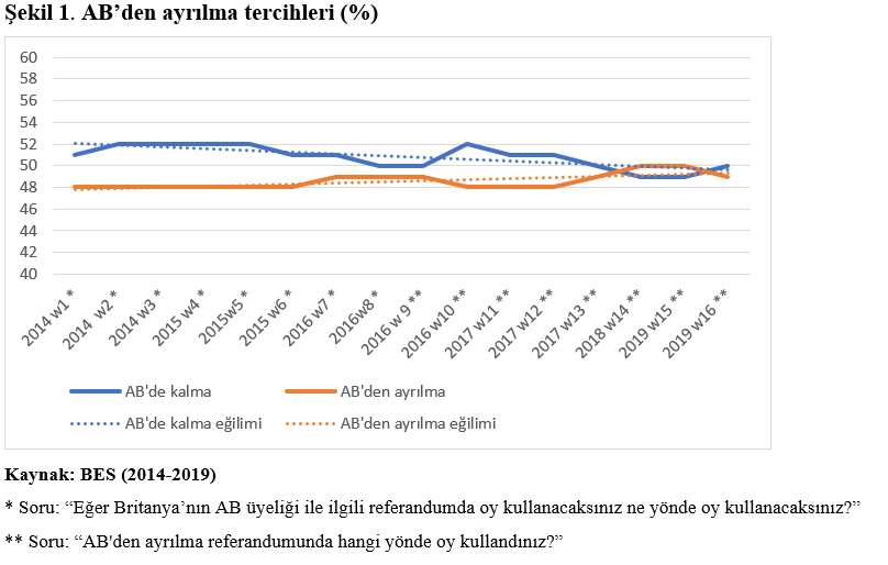 Brexit sürecinin kamuoyu boyutu 2014-2019 arasında 19 dalga halinde yürütülen İngiliz Seçim Taraması (British Election Survey, BES) çerçevesinde “AB üyeliği referandumunda ne yönde oy kullanacaksınız?” sorusu ile takip edildi. Şekil 1’de görüldüğü üzere Britanyalıların AB’de kalma eğilimi 2016 referandumuna kadar ortalama 2 puan daha yüksekken, referandum tarihi yaklaştıkça AB’den ayrılma eğiliminde hafif bir yükselme gözleniyordu (BES 2017). BES’in “Gelecekte AT ve Birleşik Kırallık ilişkilerinin nasıl ilerlemesi gerektiğini düşünüyorsunuz?” sorusuna 1997’de “AT’den ayrılmalı” diyenler yüzde 19 iken, bu oran 2016 yılında yüzde 36’ya çıkmıştı. Benzer şekilde, “AT’de kalmalı ama AT’nin gücünü azaltmalı” cevabı 1996’da yüzde 39 oranında destelenirken, 20 yıl içerisinde bu oran 10 puan azalmıştı.