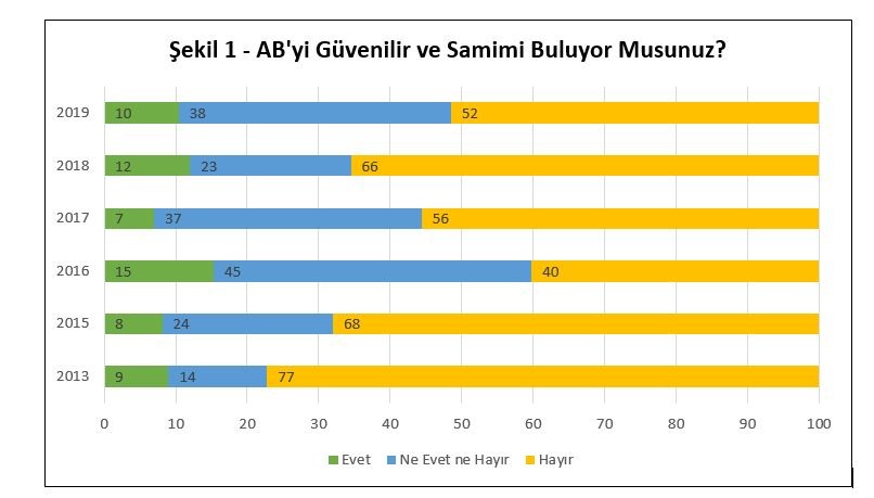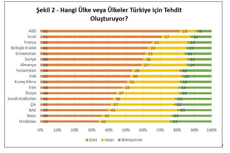 Kadir Has Üniversitesi Türkiye Araştırmaları Merkezi’nin yaptığı kamuoyu araştırmaları da, Batı’ya yönelik algıda benzer çelişkileri ima etmektedir. Örneğin, katılımcılara AB’yi güvenilir ve samimi bulup bulmadıkları sorulduğunda, katılımcıların büyük kısmı, çoğu yıl, “hayır” cevabını vermiştir (bkz. Şekil 1). Benzer şekilde, katılımcılara hangi ülkelerin Türkiye için tehdit oluşturduğu sorulduğunda, yanıt verenlerin çoğu ABD, Fransa, İngiltere ve Almanya gibi Batılı ülkeleri belirtmişlerdir (bkz. Şekil 2).