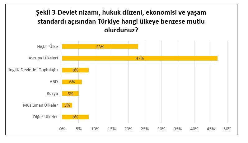 Buna karşın, olumsuz fikirlerle çelişen olumlu görüşlere de rastlanmaktadır. KONDA tarafından 2018 yılında gerçekleştirilen bir kamuoyu araştırmasına göre, “Devlet nizamı, hukuk düzeni, ekonomisi ve yaşam standardı açısından Türkiye hangi ülkeye benzese mutlu olurdunuz? ” (bkz. Şekil 3) sorusuna ankete katılanların neredeyse yarısı Avrupa ülkeleri cevabını vermiştir. ABD ve İngiliz Devletler Topluluğu’nu seçenler de eğer cevaba Batı’nın bir parçası olarak dahil edilirse, katılımcıların çoğunun Batılı yaşam standartlarını tercih ettiği açıktır. Öte yandan, Türkiye’nin benzemesini istediği başka bir ülke olmayanların oranı %23’lük bir azınlıktır.