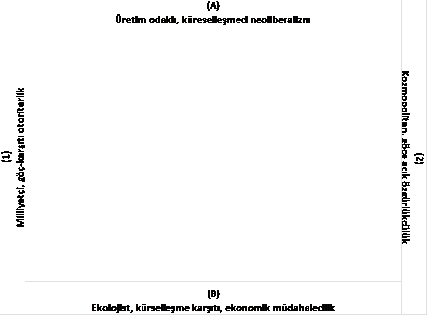 Bu yeni parti sisteminin ve onun aktörlerinin seçmen nezdinde nasıl karşılık bulduğunu etraflı bir şekilde inceleyen Gougou ve Persico (2017), veri toplama çalışmaları seçimlerden sonra gerçekleştirilen 2017 French Election Study anketi üzerinden Fransız siyasetindeki ideolojik karmaşıklığın haritasını çıkarırlar. Gougou ve Persico’ya göre, meseleler ve onlara yönelik tutumlar düşünüldüğünde, adaylar ve seçmenler arasındaki bağ tek boyutlu bir “sol, merkez(-sağ), aşırı sağ” doğrusu üzerinden gelişmemektedir. Bu çalışmaya göre, 2017 seçimlerinde ortaya konan vaatler, programlar ve seçmenlerin bunlar üzerinden gelişen tercihleri düşünüldüğünde, Fransa siyaseti birbirinin kesen iki eksenli bir düzlem üzerinden anlam bulur. Bu eksenlerden ilkinin bir ucunda “üretim odaklı, küreselleşmeci neoliberalizm”(A) diğer ucunda “ekolojist, küreselleşme karşıtı, ekonomik müdahalecilik” (B) yer alırken; ikincisinin bir ucunda “milliyetçi, göç-karşıtı otoriterlik” (1) diğer ucunda “kozmopolitan, göçe açık özgürlükçülük” (2) bulunmaktadır. Benim 2022 Cumhurbaşkanlığı seçimlerini yorumlarken referans alacağım anahtar da işte bu iki eksenli düzlem olacak.