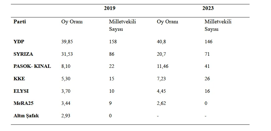 2023 Seçimlerinde 5 parti yüzde 3 seçim barajını geçmeyi başararak meclise girdiler. Ancak bu partilerin ideolojik dağılımı koalisyon hükümeti kurmayı zorlaştıran bir tablo çiziyor. İktidardaki Kiryakos Miçotakis’in muhafazakâr Yeni Demokrasi Partisi (YDP); Aleksis Çipras liderliğindeki ana muhalefet radikal sol SYRIZA partisi; Nikos Andrulakis liderliğindeki sosyalist PASOK; Dimitris Kutsumpas liderliğindeki Yunanistan Komünist Partisi KKE ve Kyriakos Velopulos liderliğindeki milliyetçi ELYSİ partisi. 2015 Çipras hükümetinde yer alan eski maliye bakanı Yanis Varufakis’in MeRA25 partisinin seçim öncesi yüzde 4 oy alması bekleniyordu; ama parti yüzde 3 barajını geçemedi. 2020 yılında ‘suç örgütü’ ilan edilerek dağıtılan ve lider kadrosu tutuklanan neo-Nazi örgütü Altın Şafak ise 2023 seçimlerine katılamadı. Altın Şafak Eylül 2015 seçimlerinde yüzde 7 oy ile 18 MV kazanmıştı; ama 2019 seçimlerinde yüzde 3 seçim barajını geçmeyi başaramadı. Milliyetçi-muhafazakâr oylar YDP’ye geçti. Altın Şafak partisinin seçimlere katılamaması, SYRIZA’nın sol seçmenini konsolide edeceği karşıt partinin varlığını da ortadan kaldırmış gözüküyor.