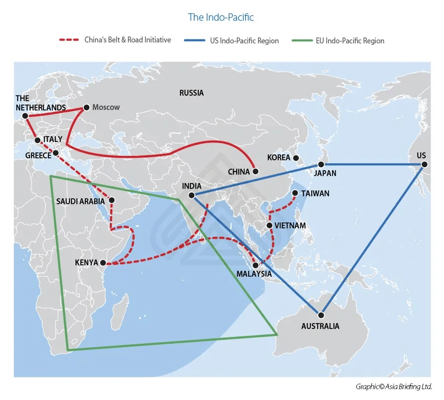 The Indo-Pacific region is a political term to dub the geopolitical area that stretches from the west coast of the United States (U.S.) to the west coast of India. It connects the tropical waters of the Indian Ocean with the western and central Pacific Ocean and is made up of twenty-four countries, all of which have remarkably different political structures and levels of power. The term “Indo-Pacific” initially used by the Obama Administration[1] and announced by the Secretary of State Hillary Clinton to define the U.S. strategic plans to connect Indian and Pacific Oceans with an Indo-Pacific Economic Corridor (IPEC) and through the political and military “pivot to Asia” is increasingly superseding the previously common term “Asia-Pacific”. President Barack Obama’s foreign policy response to the rise of China was combining economic, diplomatic, and cultural engagement with military containment. [2] The policy of containment and engagement towards China stands on the policy of intensive engagement with China, which has been executed since President Richard Nixon’s 1972 visit. However, China’s growing strength, and its economic mercantilism led Trump and Biden administrations to distance from engagement as they perceived China’s stance as a challenge to the U.S. global leadership. The map below displays how the roads for hegemonic and regional powers to international engagement cross as the global order continues to shift first to the Asia-Pacific trade axis then to the Indo-Pacific Region.[3]